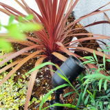 お住み替えに伴い1台分の車庫を庭を一部削って2台分+自転車置場に増設。門袖ウォールやメタル調の間仕切りフェンスなどで黒×木調を基調にファサードをモダンに演出。庭、外構ともモダンで機能的、お手入れし易いセミクローズ外構にしています