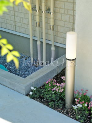 門袖の手前に設置した花壇スペースとポールライト。隣は車庫脇には花壇を設置。現在は砂利を入れています。