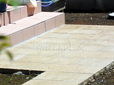 庭側に降りる階段。コンクリート製枕木の立ち上がり+アプローチと同じ「カリムぺイブ」の床面