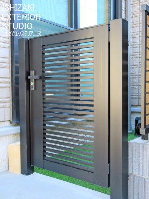 既存車庫側への出入口に新設した「開き門扉AB YS1型」