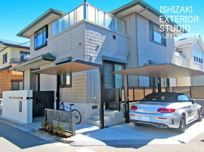 2.玄関周りはホワイトウォールの門袖にブラックのベース、ポスト、宅配ボックス、LED表札「レゴリス」でスタイリッシュに。アプローチにはグレー系のタイルとメインの門扉にはメタル調の「開き門扉AA MM1型」を設置してスタイリッシュに。反対側の既存車庫側にもアクセス出来るように階段と片側門扉「開き門扉AB YS1型」、ウォールライトを設置。
