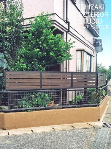 道路沿いで目線が気になった境界フェンスの内側に、2段柱と木調フェンスで気になる部分のみピンポイント目隠し。通行人と目が合うような事が無くなりストレスが減ったと喜ばれました。
