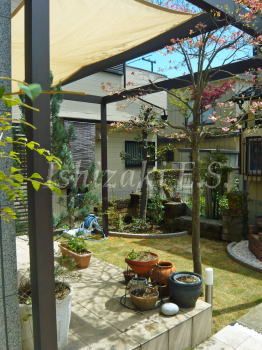 既存のテラスはそのまま活用しつつ、LIXILのプラスG「テラスフレーム」を設置して庭に立体感と奥行をプラス。リビング前には日除けのシェードを設置して夏場の強烈な陽射しもシャットアウト!!外構のモダンアジアンテイストを損なわないように柿渋カラーでカッコ良いお庭にリフォームしています。
