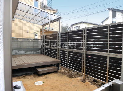 3.フェンスの内部には奥行ぎりぎりまでオリジナルの人工木材のウッドデッキと門扉側にステップを設置。デッキ下には野良猫などが入り込まないようにネットを張っています。