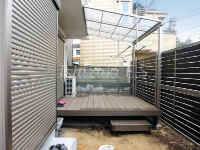 LIXILのリフォームコンタクトからのご依頼だったM邸。既存の庭はオープン外構で車庫前の道路からの見通しが良く、掃き出し窓前のお庭スペースも建物内部も外から丸見え。とてもお庭を楽しめるような状態ではありませんでした。そこでセレビューフェンスの目隠お庭に沿ってグルッと回して門扉を設置。内部には人工木材のウッドデッキと雨除けのテラス屋根を設置してクローズガーデンに変更。プライバシーを確保しつつ、安心してお庭を楽しめるようにしています。