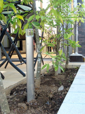 3.隣家側には化粧ブロックの花壇を設置、既存の常緑樹を移植して目隠しに。足元にはシンプルなポールライトを。