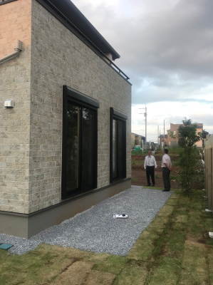 1.建物に沿うようにベージュのタイルテラスを設置。車庫側には階段を付けています。