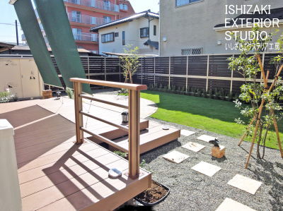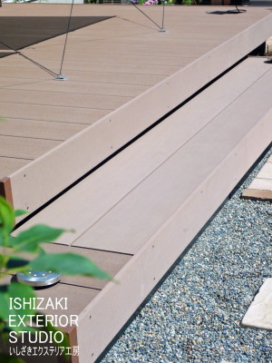 2.リビングと勝手口に沿ってLIXILの人工木材のウッドデッキ「レストステージ」を設置。前面とサイドには段床ステップを設置して庭側へのアクセスを良く。勝手口前のみ横ビームフェンスを設置。カラーはナチュラルなクリエモカをセレクト。