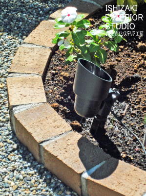 5.デッキ脇にはレンガ調サークル立水栓の他、家庭菜園用の人工枕木の花壇、レンガで縁取りしたエゴノキやソヨゴなどのシンボルツリーを植え、その他のスペースは芝生敷きでお子様が遊べるように。