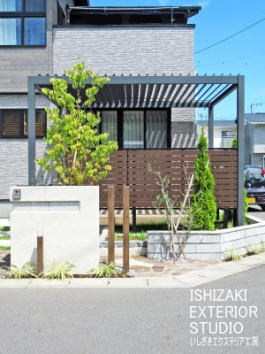 2.パーゴラの柱に沿うようにブラック×木調のYKKapの目隠し「ルシアスフェンス」をL字型に設置。多段柱を使用して気になる部分のみ重点的に目隠ししています。