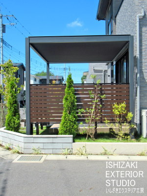 リビング前のテラスに日除けや道路側からの目隠しフェンスの設置をお考えだったN邸。天井ルーバーを開閉して日除けや雨除けが出来るパーゴラと木調の目隠しフェンスを設置してモダンで機能的な庭空間に。特に天井の開閉ルーバーは優れた機能でスタッフの一押し製品です!!
