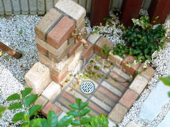フォーカルポイントに設置したレンガ調立水栓スクエア。周囲には常緑樹の他、アナベルなどの低木で華やかな水場を演出。